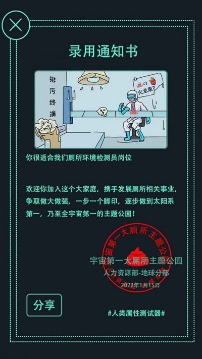 1. 全面测试人类属性:游戏提供了多样性的测试题目,覆盖了智力、情商、创造力等多个方面,帮助玩家全面了解自己的人类属性。 2. 个性化分析报告:游戏根据玩家的回答,生成个性化的分析报告,帮助玩家深入了解自己的特点和潜力,为个人发展提供参考。 3. 方便随时测试:玩家可以随时随地通过手机进行测试,无论在家、学校还是旅行中,都能轻松愉快地进行探索。 4. 互动分享乐趣:游戏支持与好友进行测试成绩的比较和分享,在比较中增加游戏的趣味性和互动性,让玩家享受互动的乐趣。