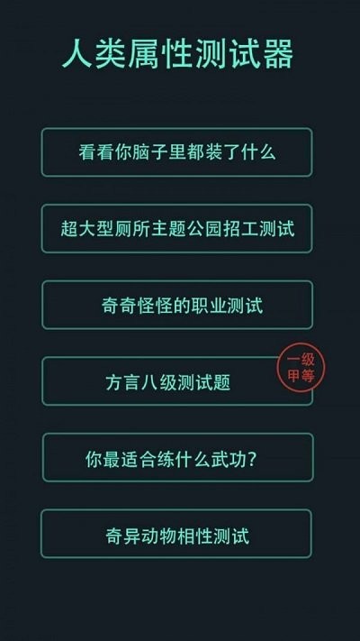 1. 多样性的测试题:游戏中提供了大量有趣的测试题目,覆盖了多个方面的人类属性。玩家可以尽情测试自己在各个领域的表现,发现自己的优势和潜力。 2. 个性化结果分析:根据玩家的回答,游戏会给出个性化的结果和分析报告。玩家可以从中了解自己的特点和发展方向,为个人成长提供指引。 3. 简洁易用的界面:游戏采用简洁明了的界面设计,操作简单易上手。玩家可以随时随地进行测试,轻松愉快地探索自己的潜能。 4. 社交分享功能:游戏支持与好友进行测试成绩的比较和分享。玩家可以邀请好友一起参与测试,比较测试结果,增加游戏的趣味性和互动性。
