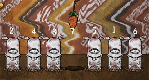1、在游戏中的第三章中,有一个关卡是关于兔子骨头的。进过洞口时,依照图中1-7的顺序点击洞口,会唤醒七只可爱的兔子,其中一只正处于中央,会被美味的胡萝卜吸引,然后你将看到它们“咬钩”的一幕。