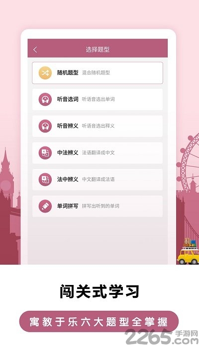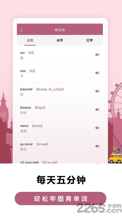 在单词学习模块中,用户可以通过游戏化的方式记忆法语单词,包括拼写练习、词义辨析和语音播放等功能。