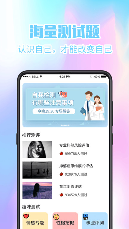 1. 自助心理评估:应用内置了专业的心理评估问卷,用户可以定期填写评估自己的情绪和心理状态,应用可根据评估结果提供相应的个性化建议和应对策略。
